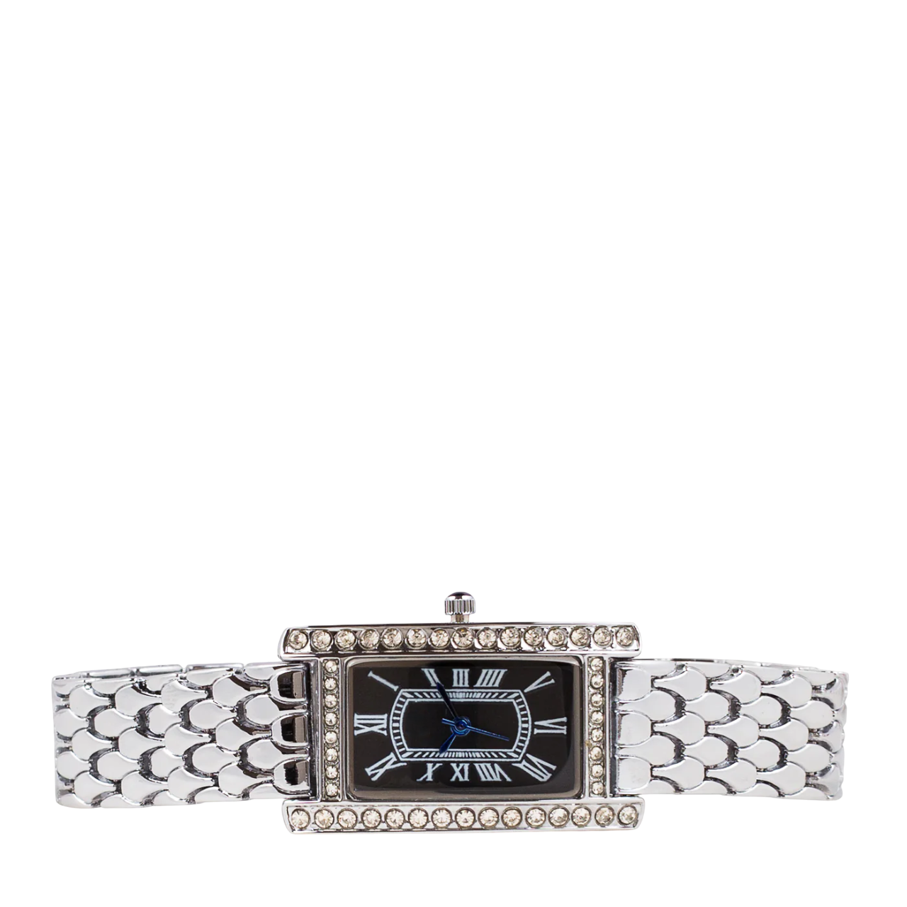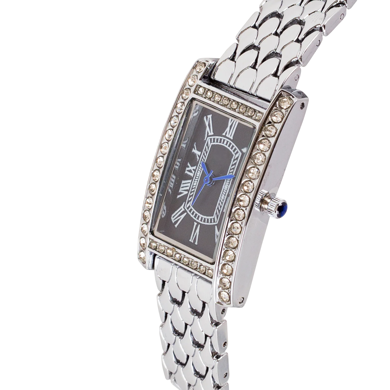 Bold and timeless, the Regal Rectangle watch features a sleek rectangular black dial with Roman numerals and a stunning silver strap. The bezel is adorned with sparkling stones, creating a perfect balance of vintage elegance and modern flair.